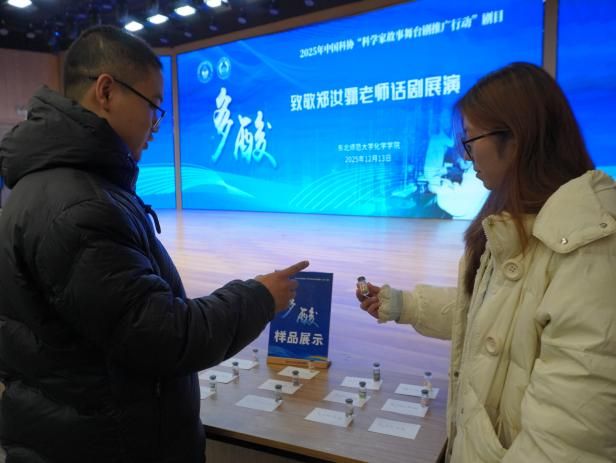 本次创排与展演得到了中国科协青少年科技中心、吉林省科学技术协会、学校关心下一代工作委员会、学校团委等部门的大力支持。多年来,东北师范大学化学学院始终坚持弘扬科学家精神,深入挖掘院史文化,打造沉浸式学生思想政治教育场域。话剧《多酸》已连续展演5年,始终坚持“让学生演老师,让学生演学长”的特色模式,从剧本打磨、导演构思到舞台呈现,全过程均由学生自主完成,现已成为学院推进科学文化与思政育人深度融合的品牌项目。今年,在话剧展演的同时,现场设置多酸样品展示区,将舞台艺术与科学实物相结合,使学生近距离、多维度地感受多酸的科学魅力,进一步拓展了话剧的教育内涵与科普功能。